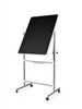 Передвижная поворотная доска установлена на металлической стойке, позволяющей ей поворачиваться вокруг горизонтальной оси. Рабочая поверхность изготовлена из полимерного листа высочайшего качества. Обрамление доски — высокопрочный алюминиевый профиль, благодаря чему имеет высокую износоустойчивость и прочность. Вы также можете размещать дополнительные наглядные материалы, плакаты и использовать доску в качестве экрана для проектора. Имеется лоток для мела/маркеров и принадлежностей. Доску вы без усилий можете поставить в любое место вашей комнаты, так как к металлической стойке приделаны четыре колеса. Колёса одной из опор имеют механизм блокировки, это делает конструкцию неподвижной при необходимости. Все школьные доски соответствуют ГОСТ 20064-86 ДОСКИ КЛАССНЫЕ